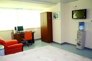 一室一厅一卫的居家设计,宽大柔软的席梦思床,设施齐全的整体浴室,打破了传统病房的色彩设计,清雅的设计以及良好的采光让人没有住院的感觉,此外,宽屏液晶电脑、微波炉、冰箱等配套家电都透露出居家的温馨。